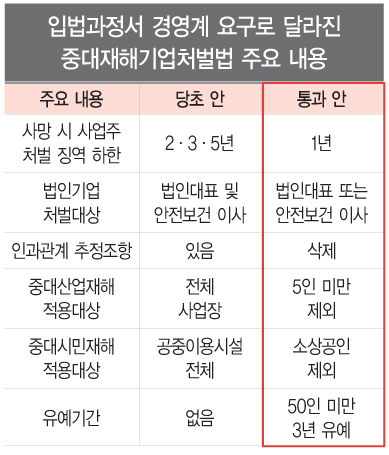 이는 발의한 원안에 비해 벌금의 상한이 높아졌을 뿐 전반적으로 처벌 수위는 턱없이 낮아졌습니다. 더불어민주당이 발의한 원안은 징역 2년 이상 또는 벌금 5억 이상이었죠. 정부안은 징역 2년 이상 또는 5000만 원 이상 10억 이하 벌금이었고요. 그런데 최종 통과된 안은 징역형이 1년으로 낮아지고 벌금의 하한도 사라졌습니다. 영세사업자나 소상공인 업주의 타격을 핑계 삼아 징역형을 낮춘 것도 코웃음이 나지만 벌금의 하한선을 없애버렸다는 것은 심각한 문제입니다. 산업재해의 76.6%는 법 적용에서 빠지거나 유예된 영세사업장에서 일어나기 때문입니다.