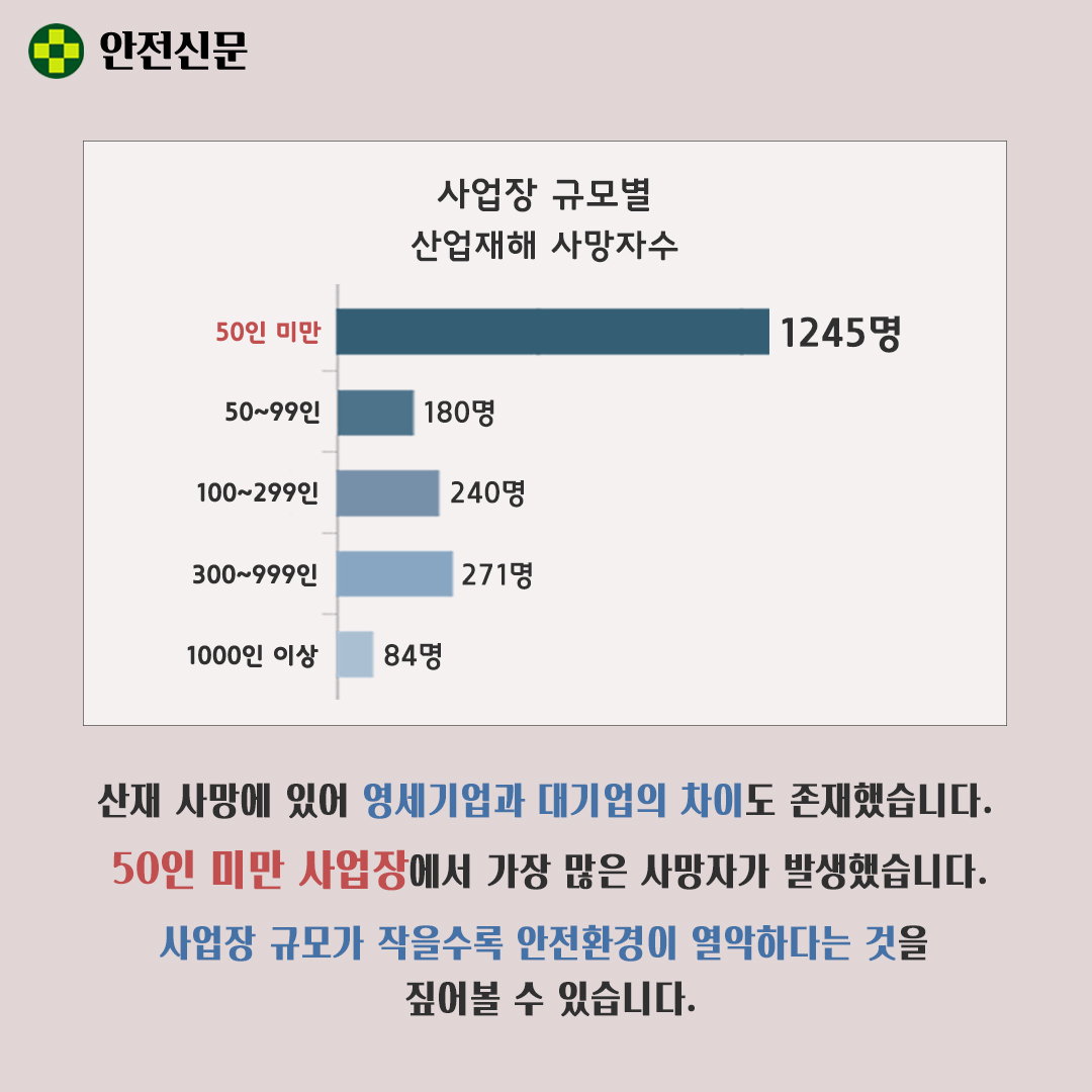 산재 사망사고에도 영세기업과 대기업의 차이는 존재합니다. 2019년 통계를 보면 50인 미만 사업장에서 1245명(61.6%)으로 가장 많은 사망자가 발생했습니다. 300~999인 사업장은 271명(13.4%), 100~299인 사업장은 240명(11.9%), 50~99인 사업장은 180명(8.9%), 1000인 이상 사업장은 84명(4.2%) 순입니다. 이를 보면 사업장 규모가 작을수록 안전 환경이 취약하다는 점을 알 수 있습니다.