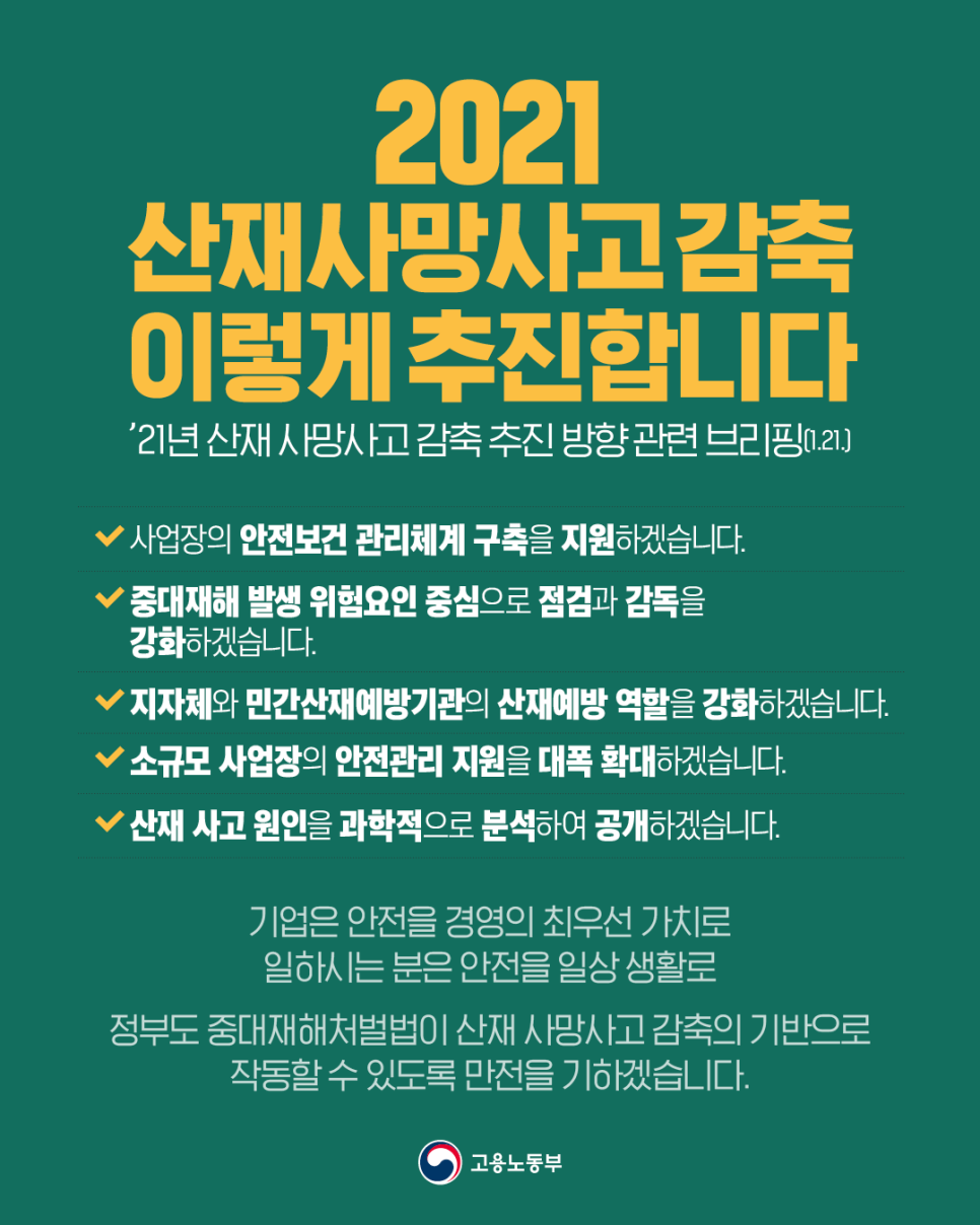 고용노동부는 지난 1월 21일 '21년 산재 사망사고 감축 추진 방향 관련 고용노동부 장관 브리핑'이라는 보도자료를 통해 고용노동부는 중대산업재해 소관 부처로서 기업의 불안감을 해소하고, 노동자가 안전하게 일할 수 있도록 산재 예방과 사망사고 감축에 최선을 다하겠다고 밝혔습니다. 이와 관련해 21년 산재 사망사고 감축 추진 방향을 다음과 같이 정리했습니다.
