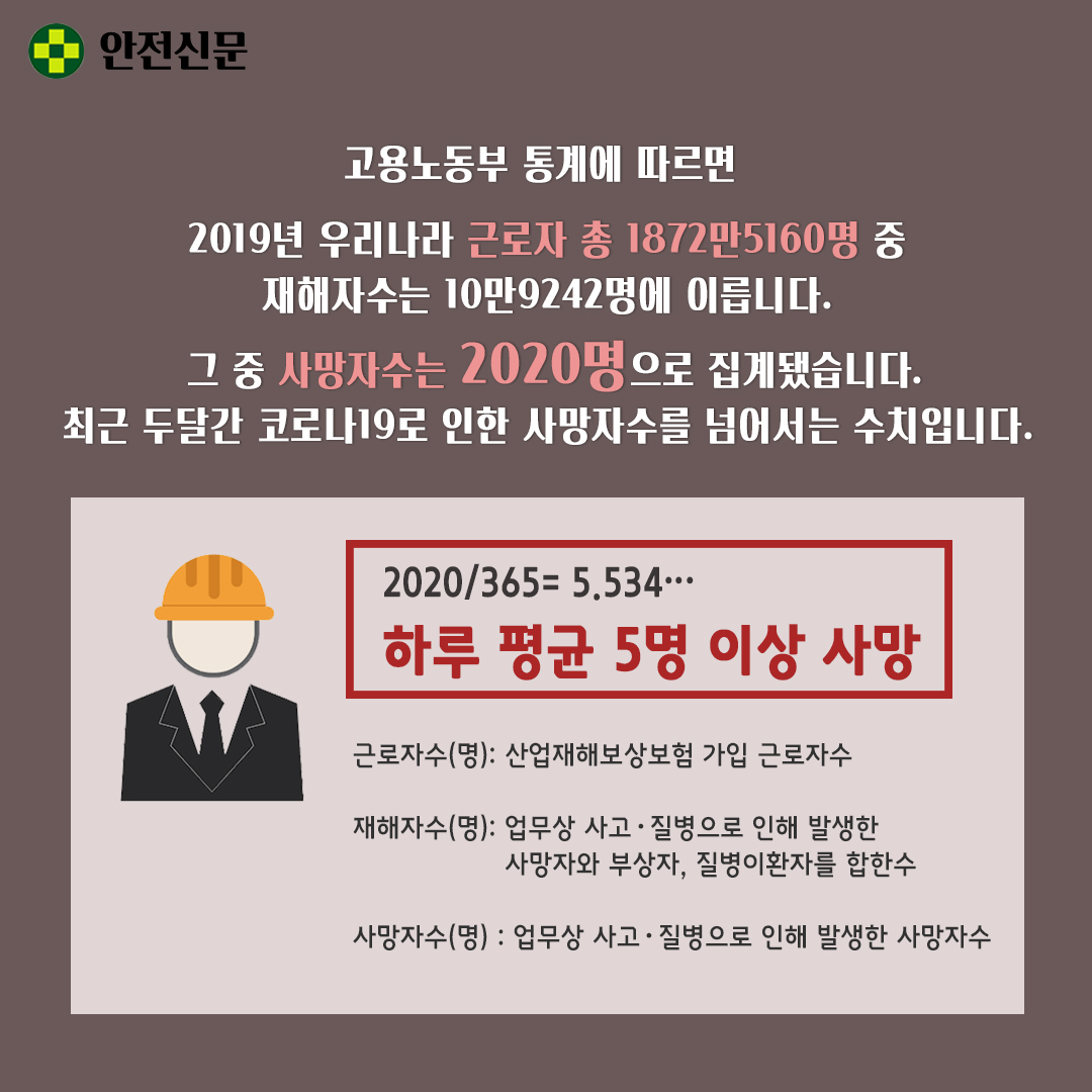 산재를 줄이기 위해서는 정부는 물론 모두의 노력이 필요합니다. 사회 전체에 먼저 사람 중심 문화를 정착시켜야 합니다. 그리고 안전을 중시하고 재해를 예방하는 기본 인프라를 갖춰야 합니다. 아울러 기업은 안전을 경영의 최우선 가치로 정립해야 하고 노동자는 안전문화를 정착하기 위해 관심을 기울이고 노력해야 합니다. 중대재해기업처벌법이 국회를 통과했지만 아직 만족할 단계가 아닌 이유입니다. 오히려 수정 법안에 대한 논의를 시작할 때입니다. 지금 이 시간에도 현장에서 숱한 노동자들이 죽어가고 있음을 기억해야 합니다.