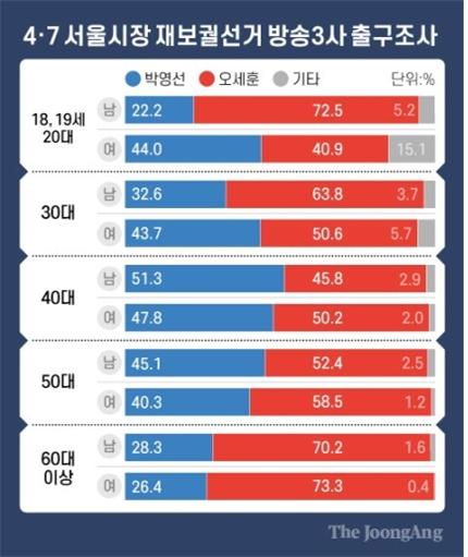 18, 19세와 20대 남성들이 오세훈 후보에게 표를 던진 것은 이번 선거에서 주목해야 하는 특징 중 하나입니다. 따지고 보면 이명박이 댓글을 조작하고 박근혜가 역사 교과서 파동을 일으키고 오세훈이 무상급식을 못 하겠다고 버틸 때 그 피해를 고스란히 받은 이들이 지금의 10~20대입니다. 그런 이들이 자신들에게 막대한 피해를 준 당의 후보를 열렬히 지지한다는 건 이해하기 어려운 일입니다. 내로남불 하는 더불어민주당이 싫었다면 다른 선택지도 많이 있었는데, 어째서 10~20대 남성들이 이렇게 표를 몰아주었는지 분석해볼 필요가 있습니다.