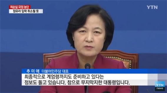 사실 우리는 국정농단 폭로로 인한 시위가 한창이었던 지난 2016년 11월 18일 추미애 당시 더불어민주당 대표의 인터뷰 내용을 통해 계엄령 선포와 친위 쿠데타에 대한 경고를 들은 바 있습니다. 하지만 당시 극우언론은 물론 시위 중인 시민들까지 이 상황에 뜬금없이 계엄령 소리가 왜 나오냐, 나가도 너무 나갔다는 의견이 상당했습니다. 하지만 지난 2018년 7월 2017년 3월 자로 국군기무사령부가 작성한 <전시 계엄 및 합수 업무 수행방안> 문건이 공개되면서 관련 내용이 사실임이 드러났죠. 추미애 전 대표는 김무성의 탄핵비화 인터뷰 후 당시 야합이라고 비판받던 김무성 전 대표와의 만남이 탄핵 추진에 결정적 순간이었다고 의미를 부여했습니다. 추미애 전 대표는 풍전등화의 위기 상황에서 용기 있는 고발을 했습니다. 이 경고가 없었더라면 우리나라가 현재의 미얀마보다 더 극단적인 상황이 되었을지도 모릅니다. 친위 쿠데타 세력이 광장에 모인 시민들을 유혈 진압하는 상황이 벌어졌을 테니 말입니다. 그 정도로 당시 계엄령 모의는 작전, 지휘, 감독, 언론 통제 등 실행 방법까지 담겨 있을 정도로 구체적이었습니다.