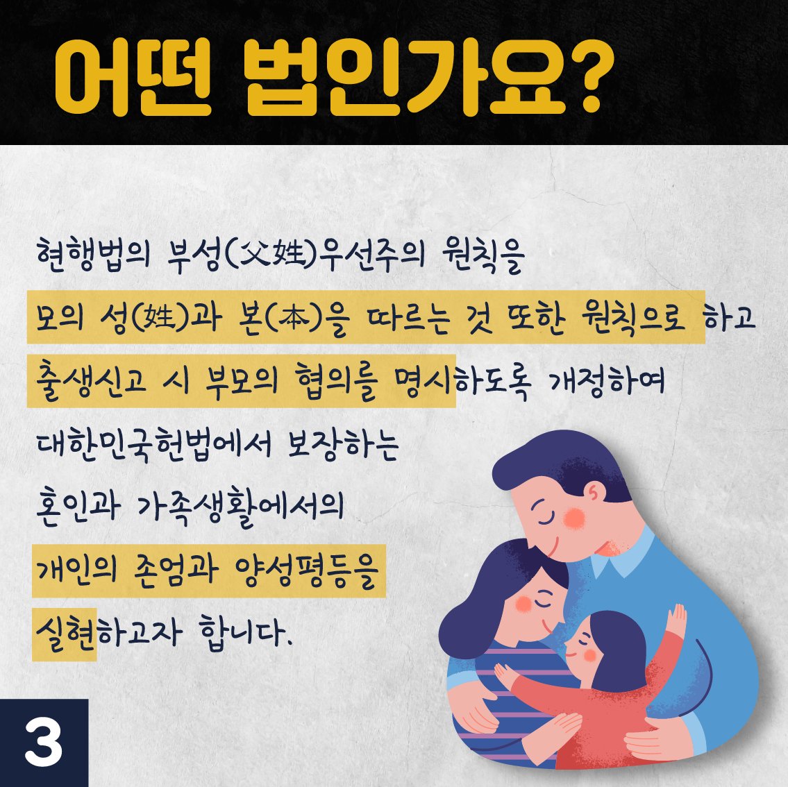 앞으로도 가족의 형태와 개념은 계속 변할 겁니다. 그에 따라 법도 변화해야 합니다. "혼인, 가족생활이 개인의 존엄과 양성의 평등을 기초로 한다"는 헌법 조항이 있는 한 가장 먼저 존중해야 할 것은 가족 구성원인 개인일 것입니다. 그 개인이 가장 행복할 수 있는 형태로 자리매김하는 것이 가족의 의미 아닐까요? 가족 개념의 변화를 좀 더 유연한 눈으로 바라볼 수 있기를 바랍니다.