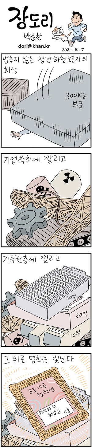 5월은 가정의 달이지만, 그 시작은 노동절입니다. 지난 5월 1일 노동절을 맞아 문재인 대통령은 노동존중사회 실현이 이 정부의 목표 중 하나라는 것은 절대 흔들리지 않는다고 했습니다. 더불어민주당은 현재 근로자의 날인 5월 1일을 정식으로 '노동절'로 바꾸고 법정공휴일로 정하자며 5월 임시국회 처리 필요성을 주장했습니다. 그간 국제노동기구(ILO) 협약이 비준되고 지난해 노동자 전태일 열사에게 국민훈장 무궁화장을 추서하는 등 변화의 흐름이 없지는 않았습니다. 하지만 노동 현장에서 일상으로 벌어지는 안타까운 청년들의 죽음을 마주하노라면, 그 노동 환경과 관련된 변화의 흐름이 너무나도 더디다는 생각이 듭니다.