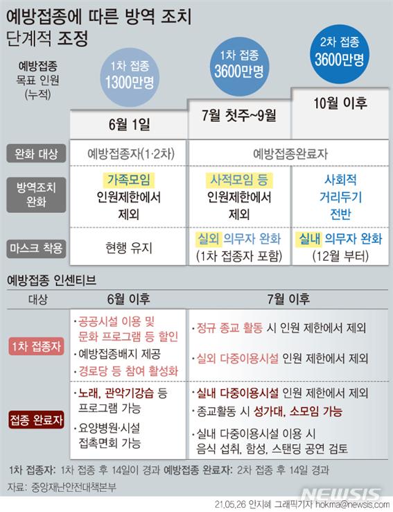 이 때문인지 정부는 백신 접종자에 한해 접종 인센티브를 주는 방안을 고려 중이라고 밝혔습니다. 현재 직계 가족 8인까지만 모임이 허용되지만 백신을 맞은 사람은 그 인원에서 제외한다는 겁니다. 노인복지시설에선 접종자를 위한 프로그램을 열 수 있게 되고 국립공원과 고궁 등의 공공시설 할인, 무료입장 같은 혜택도 내놓고 있습니다. 오는 6월까지 정부 목표치인 전 국민의 25%, 1300만 명의 1차 접종이 달성된다면 7월부터는 백신 접종자에 한해 야외에서는 마스크를 안 써도 되게 하겠다고 논의 중입니다. 2차 접종까지 마치면 어디서든 5명 이상 모일 수 있고 경기장이나 영화관에서 먹거나 마실 수도 있게 될 전망입니다. 정부는 이런 인센티브를 통해 9월까지 3600만 명이 1차 접종을 마칠 것으로 기대하는 중입니다.