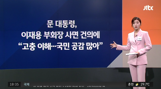 최근 한미 정상회담 이후 문재인 대통령은 4대 그룹 대표를 청와대로 초청해 오찬 간담회를 열었습니다. 성공적인 방미 회담 덕분인지 오찬 내내 화기애애한 분위기였다고 하죠. 4대 그룹 총수들은 문재인 대통령에게 삼성전자 부회장의 사면 이야기를 꺼냈습니다. JTBC는 문 대통령이 "고충을 이해한다"면서 "국민들도 공감하는 부분이 많다"라고 답했다고 보도했습니다. JTBC는 문재인 대통령이 '공감'에 대해 "우리 경제가 코로나19 위기 국면에 놓인 상황에서 기업의 대담한 역할이 필요하다는 것을 잘 안다"라고 부연했다고도 보도했습니다. 그러고는 이 부회장 사면에 대해 기존 입장에서 한 발 더 나간 것으로 해석된다고 밝혔죠.