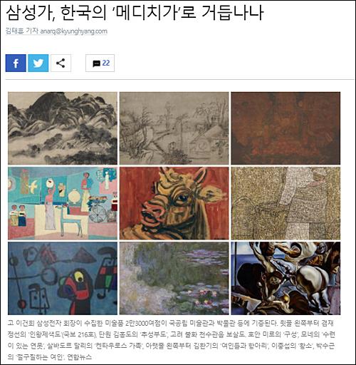 게다가 상속세 절감을 위한 꼼수인 고 이건희 회장의 미술품 기증 건 대한 언론의 미화는 도를 넘었습니다. 3조 원으로 평가받는 미술품 2만 3000점을 통 크게 기부한다며 대서특필해주었으니까요. 심지어 《경향신문》조차 '이건희 컬렉션'이라고 이름 붙여 삼성을 한국의 메디치가라고 찬양하기까지 했습니다. 기가 막혀 메디치가 무덤에서 벌떡 일어나 비행기를 타고 올 일입니다.