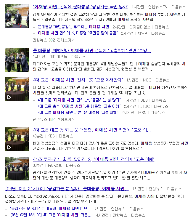 그런데 포털 다음에서 '이재용 사면'이라는 키워드로 검색하면 언론은 대부분 문재인 대통령이 이재용 사면에 동의하기라도 하는 양 제목을 뽑았습니다. 《미디어오늘》 정도만이 청와대 관계자를 취재하여 “사면에 공감하는 분이 많다고 말씀하신 것이 아니라 '국민들도 공감하는 분이 많다'고 했다”라고 답했으며, "긍정, 부정 어떤 쪽에 공감하는 이라고 특정하지 않았"고 "이전에 4주년 특별연설 때 '국민 공감대를 생각하며 충분히 국민들의 의견을 들어 판단하겠다'라고 말했던 의미로 해석이 된다"는 내용을 보도했습니다.