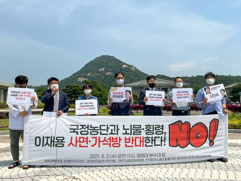 경제개혁연대, 경제민주주의21, 경제정의실천시민연합, 민변 민생경제위원회, 전국민주노동조합총연맹, 참여연대, 한국노동조합총연맹 관계자들은 2일 오전 청와대 앞에서 이재용 삼성전자 부회장 사면에 반대하는 기자회견을 열었습니다. 이들은 "국민통합과 인권증진의 측면에서 시행되어야 할 사면·가석방이 경제적 투자에 대한 정치적 대가로서, 또는 경제 논리로 환원돼 재벌의 기업 범죄 정당화에 악용되는 것을 반대합니다. 현재 이재용 사면론에 따르면 한국에서 가장 큰 규모와 영향력을 가진 기업이 총수 개인의 부재로 투자·의사결정에 제약을 받고 있다는 것인데, 노동·시민사회단체는 이러한 주장 자체가 한국 재벌기업 경영방식의 낙후성을 보여주는 것입니다. 경제정의와 지속가능성을 위해서라도 바로잡아야 할 개혁 사항입니다. 이재용 사면·가석방은 현재 진행 중인 삼성물산 불법합병과 분식회계사건 재판에도 영향을 미칠 수 있다는 점에서도 결코 허용되어서는 안 됩니다. 다른 형사재판이 진행 중인 상황에서 먼저 판결이 확정된 형사사건에 대해 사면한 전례가 없을 뿐만 아니라, 이재용 부회장이 법무부 취업제한통보에도 삼성전자 부회장직을 유지해 수형 기간 중에도 다른 범죄행위를 저지른 것으로 보고 있습니다. 노동·시민사회단체는 이재용 부회장 사면·가석방은 재벌총수 범죄에 면죄부를 주는 것이며, 사법질서의 근간을 훼손한다는 점에서도 부당하다는 입장을 밝힙니다."라며 이재용 사면에 반대했습니다.