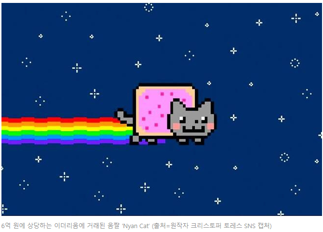 이제는 역사적 사건이나 창조성이 바탕이 된 예술품만이 아니라 흔히 짤 또는 움짤이라고 불리는 이미지나 동영상들도 경매를 통해 높은 가격에 팔리기도 합니다. 움짤로 유명했던 Nyan Cat은 6억 원 상당의 이더리움으로 거래됐으며, 재앙의 소녀 밈으로 인터넷에서 자주 쓰였던 사진은 최근 NFT로 47만 3000달러, 그러니까 약 5억 3500만 원에 팔렸다고 합니다. 이처럼 우연히 찍혔거나 장난일 뿐인 영상조차 수억씩 나가다 보니 갖다붙이기 나름이라고 볼 수도 있어서 NFT에 대한 시선은 기대 반, 걱정 반입니다.