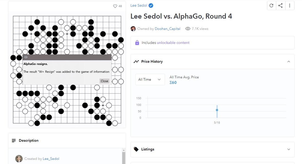 인간이 인공지능(AI) 알파고에게 유일하게 승리한 세기의 바둑을 다들 기억하실 겁니다. 바둑사와 인류사에 길이 남을 이세돌 9단과 알파고의 네 번째 대국이 지난 5월 18일 2억 5000만 원에 낙찰됐습니다. 이런 보도를 보고 의구심을 품은 분들도 있으실 겁니다. 바둑 기보를 샀다고 한들 특허처럼 자기만 쓸 수 있는 것도 아닌데 대체 대국 한 판을 어떻게, 무슨 수로 경매에 부칠 수 있는가 하고 말이죠.