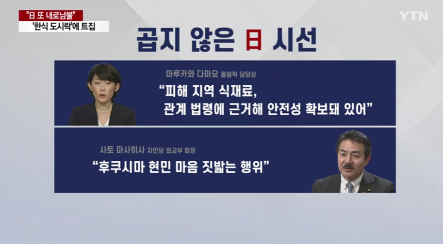지난 7월 20일 마루카와 다마요 올림픽담당상은 국무회의 후 기자회견에서 "(후쿠시마 제1원전 폭발) 피해 지역의 식재료는 관계 법령에 근거해 안전성이 확보돼 있다"며 "방사성 물질 오염을 이유로 자국 농산물을 반입할 필요가 없다고 생각한다"라고 말했습니다. 이에 앞서 지난 7월 17일 자민당의 사토 마사히사 외교부 회장은 "식자재는 대접하는 마음으로 노력하고 상당한 신경을 쓰고 있다"며 "후쿠시마현민의 마음을 짓밟는 행위"라고 비판의 목소리를 내기도 했습니다.