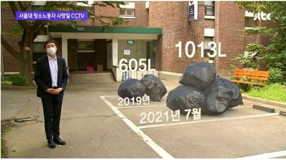 서울대 청소노동자 이모 씨는 사망 당일 학생 196명이 거주하는 기숙사를 혼자 청소한 뒤 컵라면으로 끼니를 때운 것으로 확인됐습니다. 또 다른 청소노동자의 죽음이 있었던 2019년 11월 입사해 기숙사 925동 쓰레기 수거 등 미화 업무를 혼자 담당했습니다. 925동은 기숙사 중에서도 건물이 크고 인원이 많아 일이 가장 많은 곳이라고 하죠. 코로나19 상황으로 학생들이 배달음식을 많이 시켜 먹는 바람에 쓰레기 양이 급증했습니다. 유족의 이야기에 따르면 코로나 이후 고강도 노동에 힘들어했다고 합니다. 사망한 시점인 7월에도 1톤이 넘는 쓰레기를 혼자 수거해 처리했다고 하니 과로사가 아닐 수 없죠.