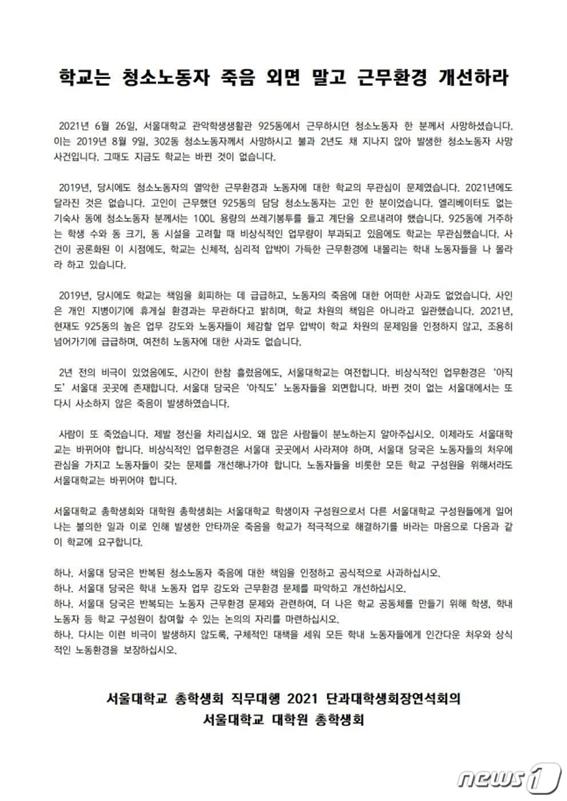 코로나19로 1년 6개월 이상을 지내는 사이 사회적 거리두기 4단계 상황을 맞이하면서도 우리의 일상이 어떻게든 돌아가는 까닭은 청소노동, 배달노동, 택배노동 등 숱한 일상의 노동을 누군가가 하고 있기 때문입니다. 학벌에 젖어 갑질이나 일삼는 자들이 사회에 어떤 유익을 끼치고 있는지 묻고 싶습니다. 사망한 청소노동자 이모 씨의 안타까운 죽음에 조의를 표하며 서울대가 속히 책임 있는 사과와 적절한 배상을 하길 요구합니다.