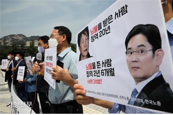 국민과 시민단체 들은 분노하고 있습니다. 여태까지 지은 죄는 물론 지난 6월 프로포폴 투약 혐의로 새로 기소된 점을 감안하면 재소자인 이재용 개인의 품행에도 문제가 있다는 의미이므로 가석방이 되어서는 안 된다는 입장이었죠. 참여연대는 문재인 대통령과 박범계 법무부 장관을 강력히 규탄하며 국민 앞에 사과해야 한다고 요구했습니다. 대통령이 탄핵된 국정농단의 주축이었던 이재용을 가석방한다면 향후 어떤 재벌총수가 법을 지킬 것이며 어떤 중범죄자에게 가석방을 불허할 수 있겠느냐는 겁니다. 한국노총 역시 여전히 법 위의 삼성이며 유전무죄, 무전유죄라고 밝히며 이번 가석방이 우리나라 사법 역사에 또 하나의 흑역사가 될 것이라고 덧붙였습니다.