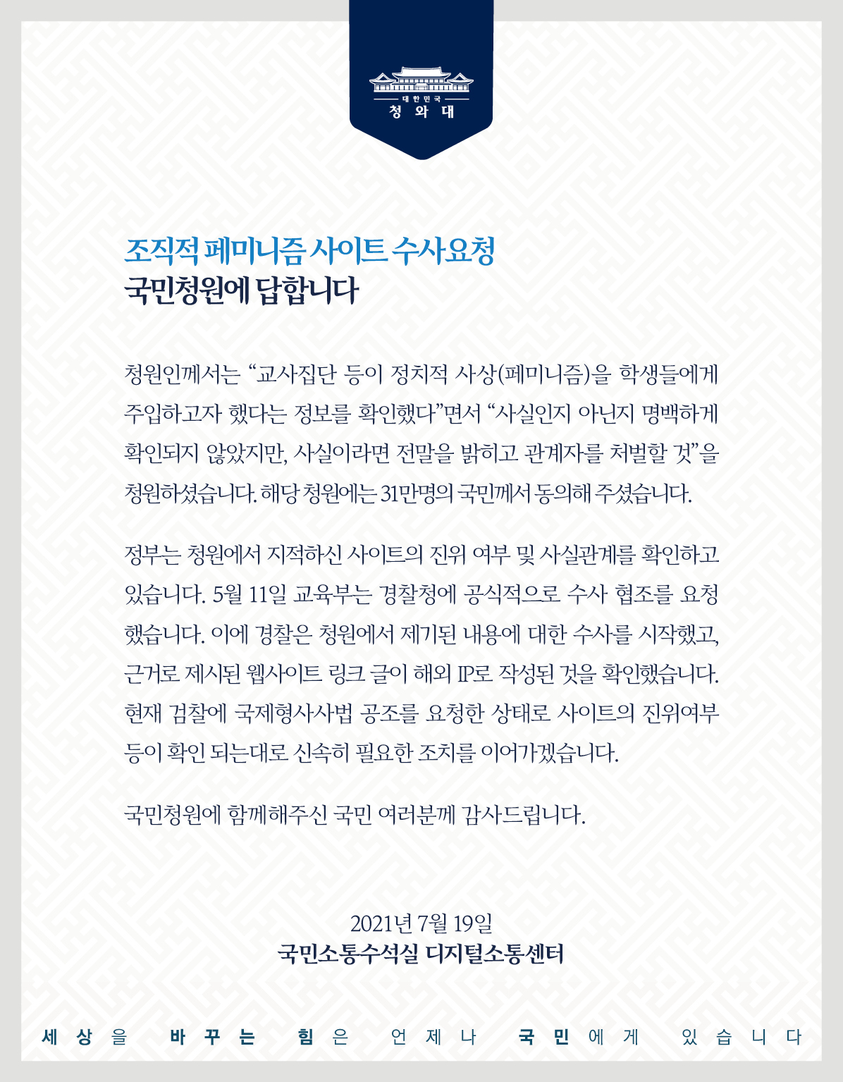 논란이 지속되자 교육부는 경찰청에 청원 내용 관련 사실관계 조사를 요청했습니다. 두 달 동안 수사했으나 피의자도 피해자도 존재하지 않는 사건이었습니다. 경찰은 청원인이 올린 웹사이트 내 게시물 작성자의 닉네임 중 경상북도 소재 한 초등학교의 이름이 포함된 것을 확인하고 학교 관계자와 담당 교육청 등을 조사했지만 피해를 본 학생은 없었습니다. 선생님 메갈이냐고 놀려대는 아이들이 정말로 이런 단체가 암약하고 있었다면 옳다구나 하고 교육부나 경찰에 신고를 했을 텐데 접수된 피해 사례는 단 한 건도 없었죠. 애초 존재하지 않는 사실을 그저 그렇게 믿고 싶어서 소설을 썼다는 얘깁니다. 그런데도 여전히 전교조가 배후네, 좌파들이 빼돌렸네 하며 음모론에서 헤어나오질 못하는 이들이 있습니다.
