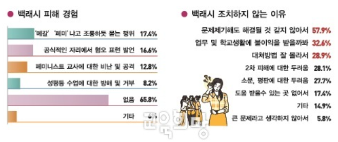 20대 여성 교사 세 명 중 두 명이 학교에서 페미니즘 백래시에 해당하는 조롱이나 공격을 경험하는 것으로 드러났습니다. 그런데 이런 피해를 보고도 과반이 2차 가해 등을 우려해 별다른 대응을 하지 못한다고 합니다.