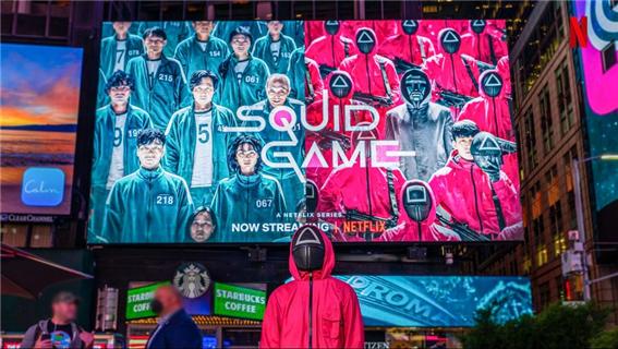 뉴욕 타임스스퀘어에 핼러윈이 끝나는 10월 말까지 <오징어 게임> 광고가 이어진다고 합니다. 핼러윈 특수를 맞아 드라마 등장인물들이 착용했던 가면, 옷, 신발 등이 그야말로 폭발적인 기세로 팔리고 있습니다. 특히 드라마 속 게임 참가자들이 신고 나왔던 하얀 실내화 같은 운동화의 경우 무려 7800%의 판매량 증가세를 보였습니다.