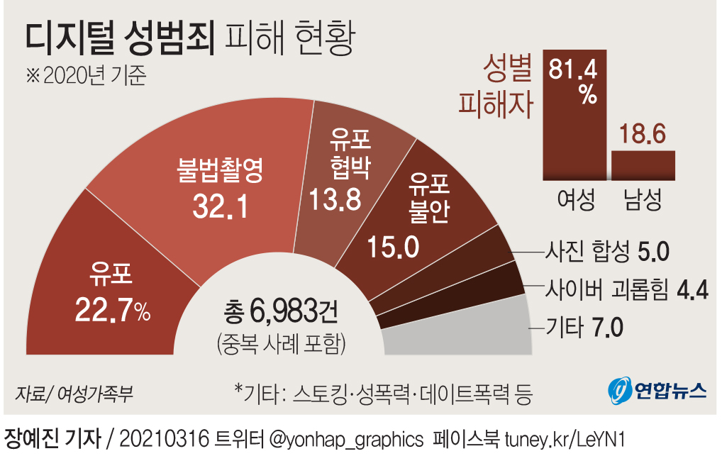지난해 여가부 디지털 성범죄 피해자 지원센터가 4973명의 피해자에게 제공한 상담, 영상물 삭제 및 수사 지원 서비스가 무려 17만 건이 넘는 것으로 집계됐습니다. 피해자 수만 2019년의 두 배를 웃도는 수준입니다. 아무리 삭제해도 인터넷 도처에 남아 있는 디지털 성착취물 때문에 2차, 3차 피해를 받는 피해자도 부지기수입니다.