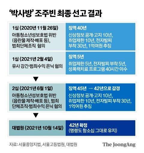 조주빈은 아동, 청소년의 성보호에 관한 법률 위반, 범죄단체조직, 살인예비, 유사강간 등의 혐의로 재판에 넘겨졌는데요, 징역 42년형 선고와 더불어 신상정보 공개, 고지 10년, 아동, 청소년 관련 기관 취업제한 10년, 전자발찌 부착 30년 등의 명령도 원심 그대로 유지됐습니다. 조주빈이 경찰에 붙잡힌 지 약 19개월 만에 확정된 형벌입니다. 나머지 박사방 운영진 네 명은 징역 7~13년이 확정됐습니다.