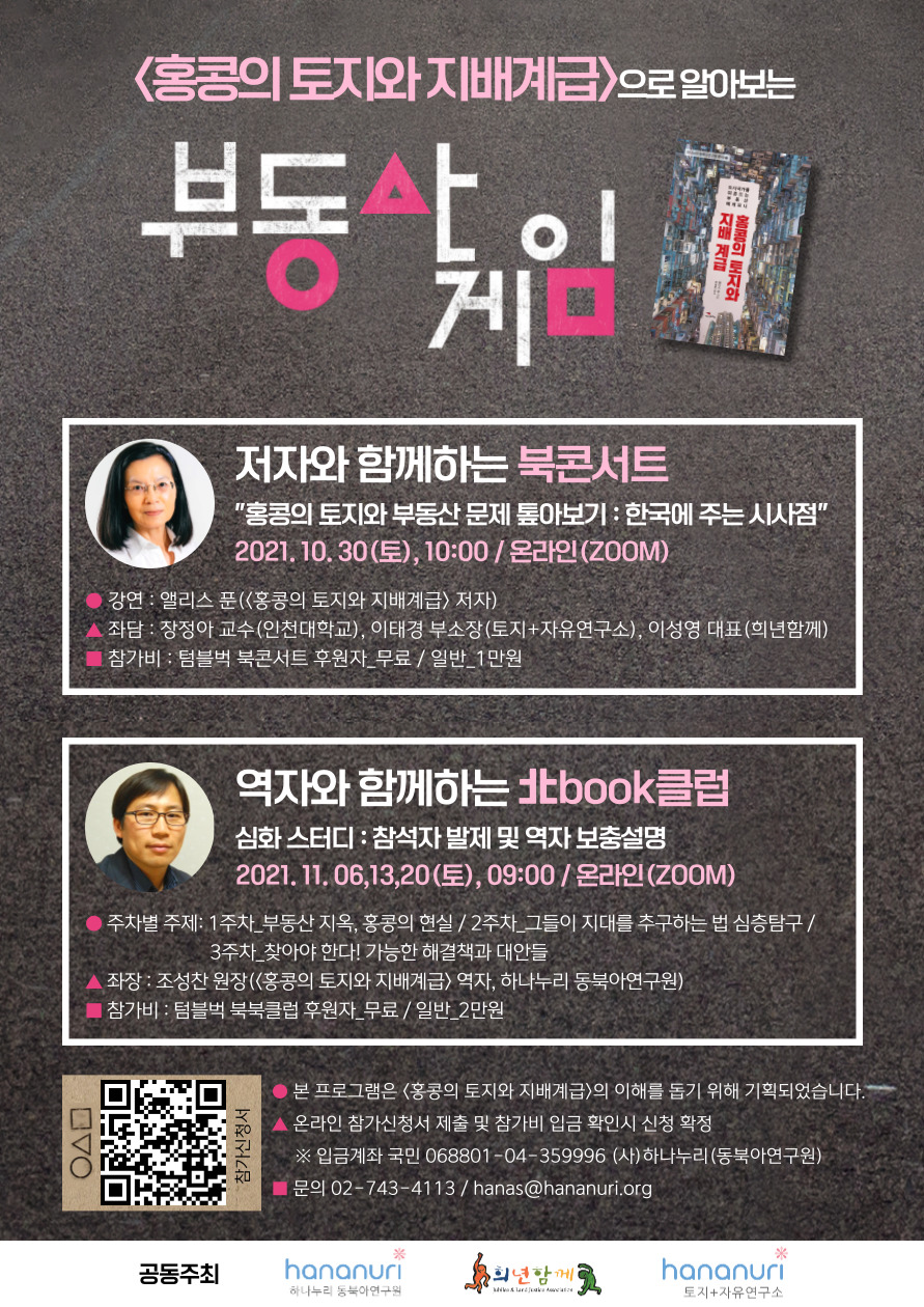 참여자의 죽음으로 상금이 축적되는 <오징어 게임>처럼 사회적 가치를 무너뜨리며 올라가는 부동산 가격! 하나누리 동북아연구원에서 번역한 <홍콩의 토지와 지배계급>으로 홍콩에 우리나라를 비춰보며 부동산 게임을 파헤쳐보려 합니다!