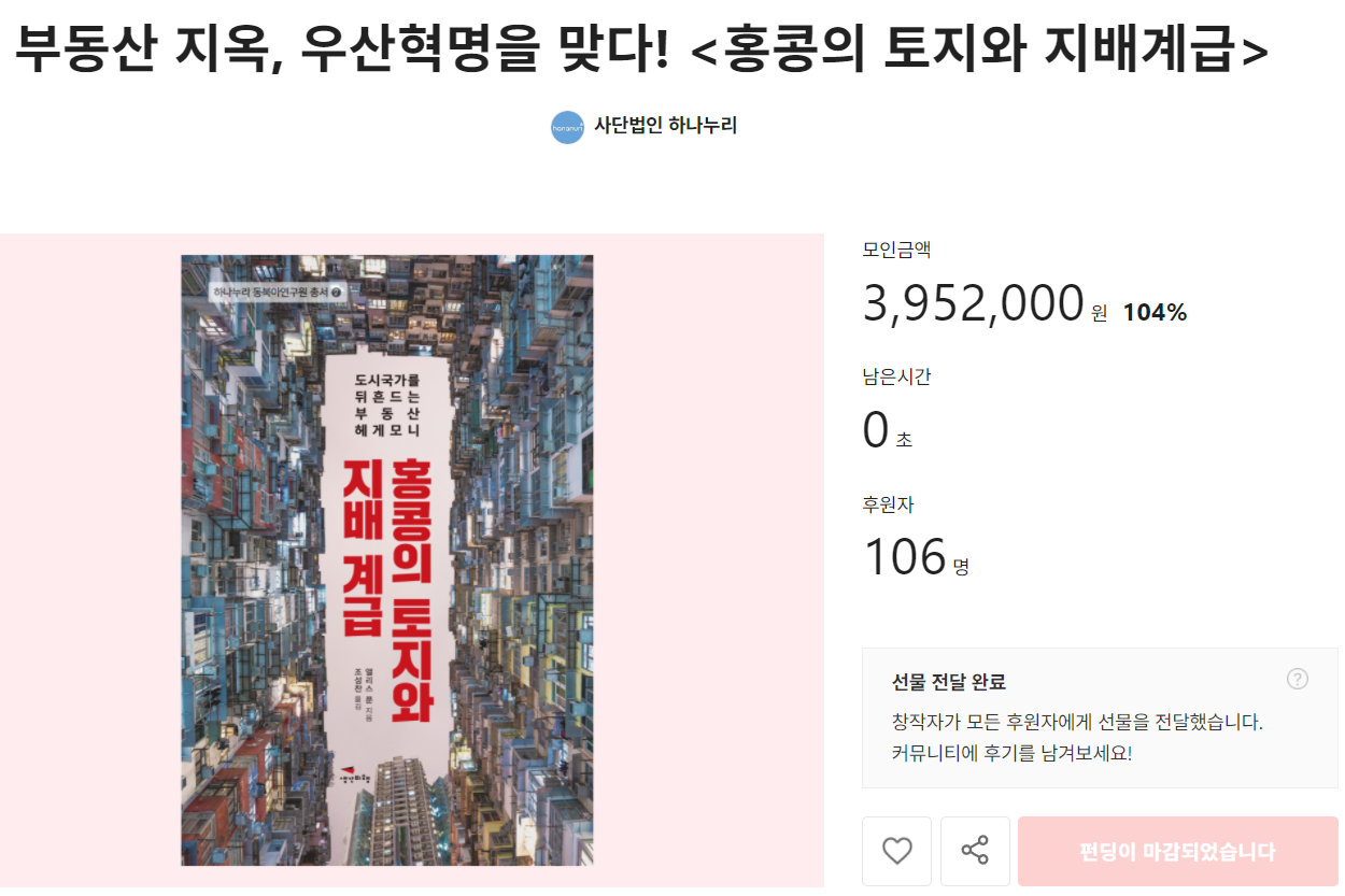 하나누리 동북아연구원이 번역하고 생각비행이 출판하면서 텀블벅 크라우드 펀딩을 시도했는데요, 106분의 후원자가 참여해주셔서 책 제작을 잘 마무리할 수 있었습니다. 출간 기념 이벤트로 하나누리 동북아연구원, 희년함께, 토지+자유연구소가 '부동산 게임'이라는 형식으로 저자와 함께하는 북콘서트, 역자와 함께하는 北book클럽을 준비했습니다.
