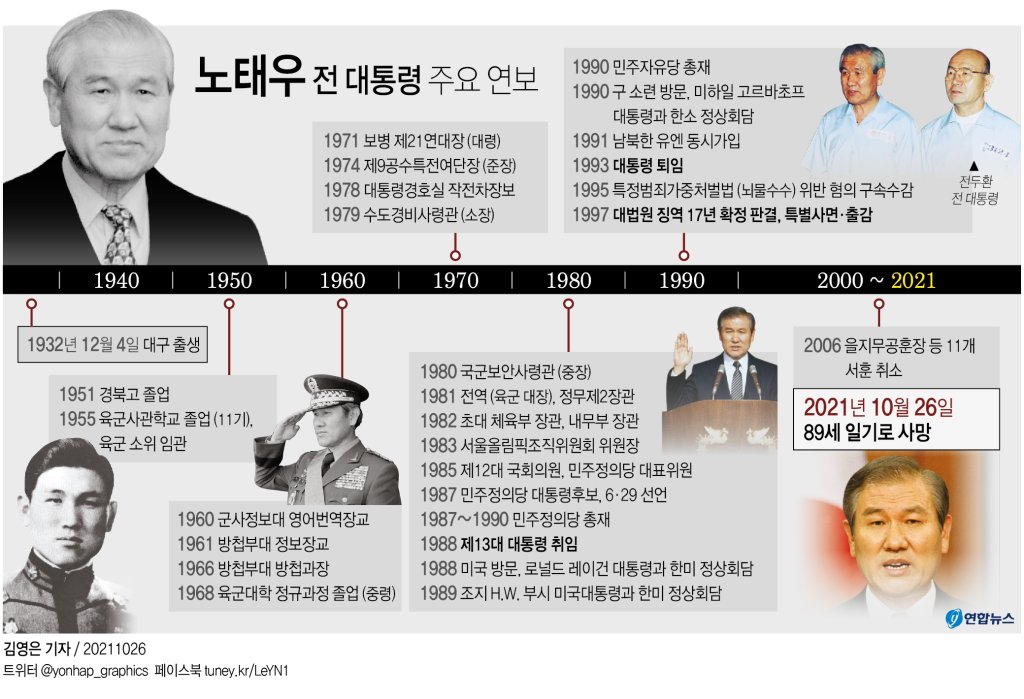 노태우 전 대통령이 사망했습니다. 전두환과 함께 신군부 쿠데타의 주역이자 그를 뒤이어 대통령을 해먹은 그가 말입니다. 노 씨의 죽음으로 12.12 쿠데타를 모의하고 5.18 광주민주화운동을 진압한 책임자 한 사람이 역사 속으로 사라졌습니다. 묘하게도 이전 5.16 군사쿠데타의 주역 박정희가 총을 맞은 날과 같은 10월 26일이었습니다.