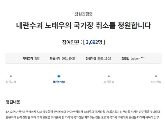 이 때문에 청와대 청원 게시판과 국회 국민동의청원에는 노태우의 국가장 취소를 요구하는 국민 청원이 동시다발로 올라왔습니다. 12.12 군사반란의 주역이자 5.18 광주항쟁 무력진압에 관여한 범죄자 노태우를 국가장으로 예우하는 것은 전방에서 묵묵히 군 복무를 하고 있는 군인들에 대한 모욕이며 우리 헌법 가치에 대한 부정이라는 주장입니다. 국가장법 개정 요구 역시 마찬가지입니다. 국가장법에 실형 등 전과가 있는 자, 전직 대통령 예우를 박탈당한 자 등의 법적 제외 요소가 명확히 있었다면 이번과 같은 논란은 일어나지 않았을 거란 얘기입니다. 향후 신군부 최대의 학살자이자 주범인 전두환을 국가장으로 예우하는 일은 없게 하자는 국민의 염원이 담겨 있습니다.
