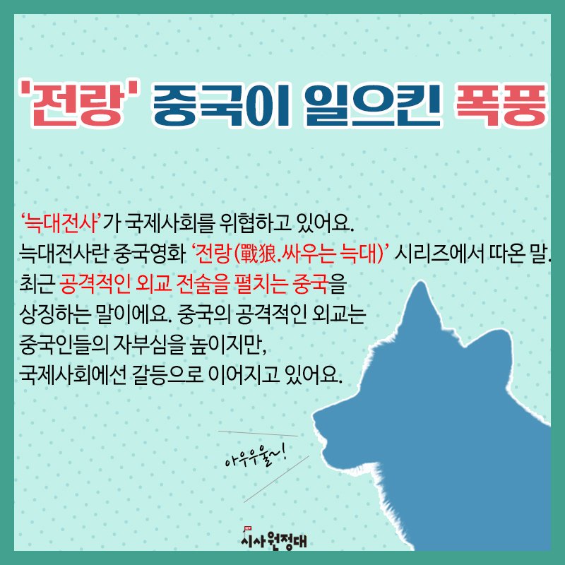 결국 요소수 품귀 현상이 왜 발생했느냐 하는 근본적인 질문을 던지지 않을 수 없습니다. 언론에 소개된 내용을 간략히 정리하자면 중국과 호주의 '석탄분쟁'이 원인입니다. 전랑외교(늑대외교)로 인해 세계 각국의 분노를 산 중국은 코로나19 사태로 인해 그동안 우호적이었던 호주와도 충돌하게 됐습니다. '전랑외교'란 경제력과 군사력을 바탕으로 무력과 보복 등 공세적인 외교를 지향하는 중국의 외교 방식을 가리키는 말입니다.