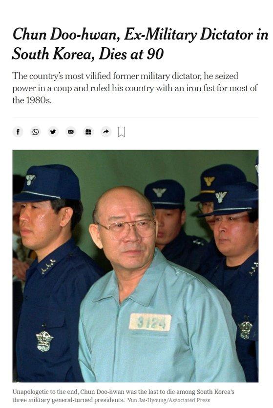 전두환에 대한 해외 언론의 평가도 비슷합니다. 《뉴욕타임스》는 지난 11월 23일 한국에서 가장 비난을 많이 받은 군 장성 출신 독재자가 사망했다고 보도했습니다. 그러면서 1980년 광주에서 시민들을 살육했다(mowdown)고 상세히 소개했습니다. 한국인 사이에서 전두환이란 이름은 폭압적인 군사 독재자와 동의어라며 올림픽 등의 성과에도 불구하고 독재 정치와 학살이라는 부정적 유산이 이를 압도한다고 평가했습니다.