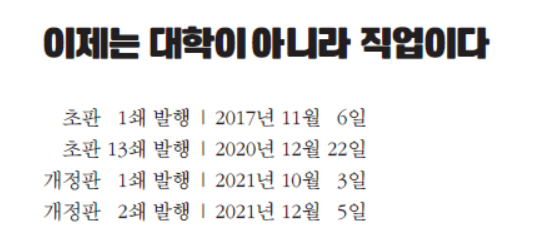 2022학년도 수능 시험이 끝나고 며칠 전에 성적표가 배부되었죠. 성적에 맞춰 대학 진학을 준비하고 있는 수험생이 많이 있을 줄 압니다. 그런데 잠깐 생각해볼 부분이 있습니다. 지난 2021년 9월 1일자 《충청투데이》에 취업난 때문에 학위에 관심이 없는 학생들까지 대학원으로 발길을 옮기고 있다는 기사가 실렸습니다. 4년 전 《이제는 대학이 아니라 직업이다》에서 손영배 작가는 박사조차 취업이 어려운 현실을 소개했습니다. 그로부터 4년이 지난 현재 교육과 관련하여 많은 변화가 있었죠.