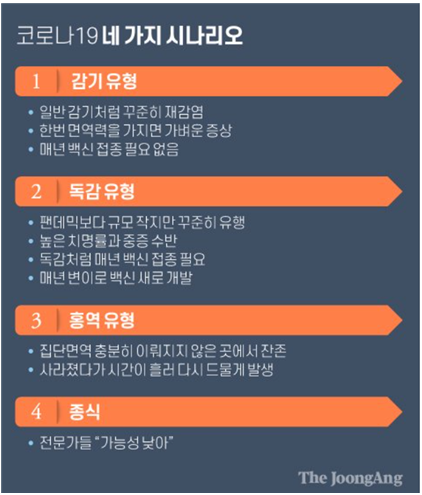 세계 각국 전문가들은 코로나19가 세계적 대유행인 '팬데믹'에서 주기적으로 발생하는 풍토병인 '엔데믹'으로 바뀌는 중이라고 보고 있습니다. 독감처럼 지역별로 해마다 유행하는 병이 될 것이라는 예상입니다. 최근 화이자를 비롯한 제약회사들이 먹는 코로나 치료제를 내놓고 있습니다. 한때 수많은 사람을 죽음으로 내몰았던 인플루엔자의 경우 이제는 매년 예방주사를 맞으며 예방하는 것처럼, 코로나19도 이와 비슷한 흐름을 보일 것으로 예상하고 있죠.