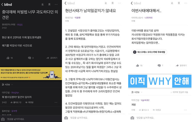 결국 뿔난 시민들은 물론 동종 건설 업계 내에서도 맹렬한 비난이 쏟아졌습니다. 현장 날씨가 영하권으로 떨어졌는데 왜 그렇게 무리하게 공사를 진행했는지 의문이라는 지적이 업계 내에서 터져 나왔습니다. 재건축이 아닌 신축 아파트에서 붕괴사고는 잔뼈가 굵은 현장 관계자들조차 처음 봤다고 하죠. 건설업계 전체는 중대재해처벌법 시행을 앞두고 법 완화를 주장하며 복지부동해도 모자랄 시기에 변명의 여지가 없도록 얼음물을 끼얹은 꼴이라고 불만을 토로하기도 했습니다.