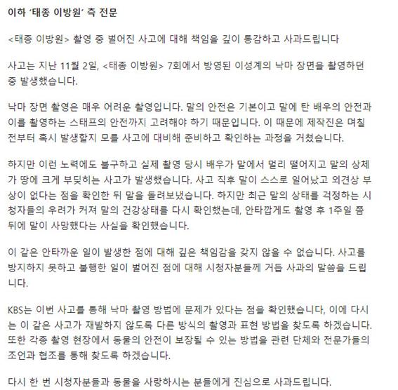 문제가 불거지자 KBS 측은 낙마 장면을 촬영한 말이 사망한 사실을 확인했다는 내용을 넣은 사과문을 올렸지만 시청자의 분노를 피해 갈 길은 없었습니다. KBS가 이번 사고를 통해 낙마 촬영 방법에 문제가 있다는 점을 확인했다는 식으로 안이하기 짝이 없는 태도를 보였기 때문입니다. 그 말 그대로 이해하자면 이번에 안 들켰다면 앞으로 계속 이렇게 찍었을 거라는 얘기 아닌가요?