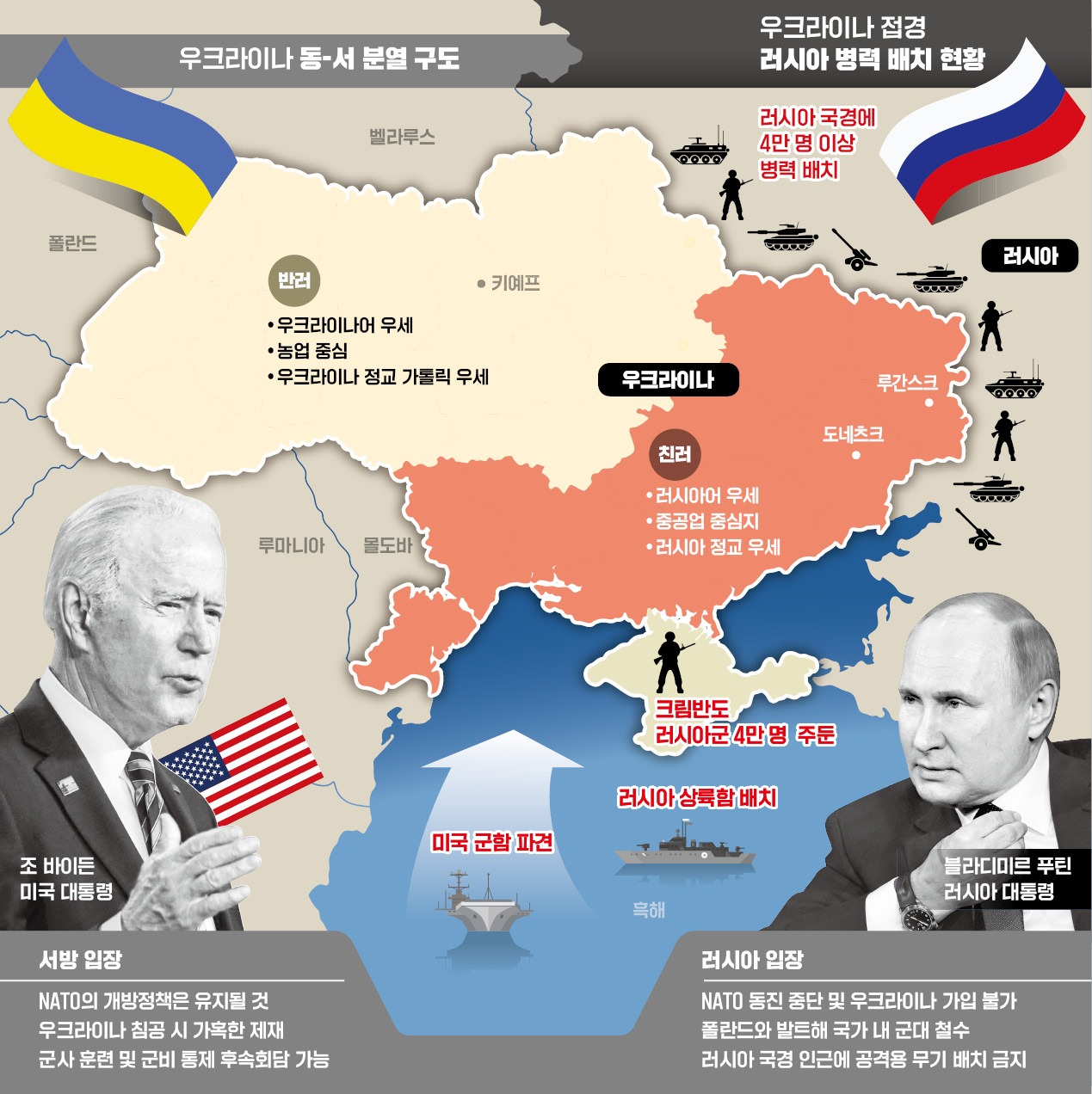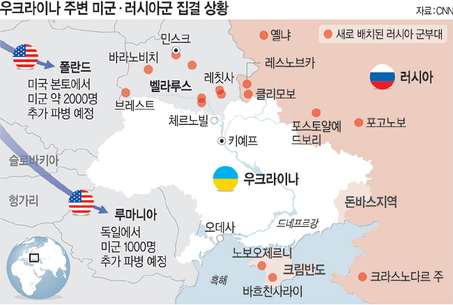이런 이유 때문에 충돌 수위가 점차 강해지고 있습니다. 바이든 미국 대통령은 푸틴이 모든 병력과 함께 진입한다면 이는 제2차 세계대전 이후 가장 큰 규모의 침공일 것이라고 했습니다. 러시아는 13만 병력으로 우크라이나 삼면을 포위하고 함정 160척을 동원해 해상 훈련을 합니다. 이에 비해 나토는 고작 5000여 명 정도가 전선 인근에 있을 뿐입니다. 이 때문일까요? 미 국방부는 만약의 경우 8500명을 파병하겠다고 밝혔습니다. 한편 영국과 프랑스, 덴마크, 스페인 등도 러시아가 침공할 경우 군함과 전투기 등을 지원하겠다고 밝혔습니다. 우크라이나를 둘러싼 미국과 러시아의 갈등이 고조되는 가운데 지난 2월 2일 바이든 미국 대통령은 미군 3000명을 독일, 루마니아, 폴란드 등 동유럽에 이동 배치하는 계획을 승인했습니다. 그런데 이 파병은 애초 8500명을 파병하겠다는 계획에는 포함되지 않는다고 하죠.