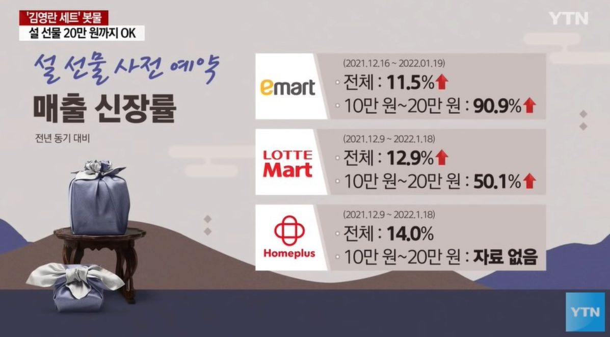 특히 올해는 임시 조치가 아닌 법 개정이 이뤄진 상황이라는 점에서 그 의미가 남다릅니다. 법적으로 완벽하게 상한선이 올라간 것이니까요. 관련 업계 사람들은 환영하고 있습니다. 한우를 비롯해 굴비나 견과류처럼 값나가는 1차 산품들은 숨통이 트였으니까요. 홍삼 같은 가공품이라도 우리 농, 축, 수산물이 50% 이상 들어갔다면 20만 원 상한까지 선물할 수 있습니다. 이번 설의 실제 소비 패턴을 보면 대형 마트 3사의 설 선물 사전 예약 판매 실적이 늘었습니다. 10만~20만 원 사이 매출 신장률이 큰 폭으로 뛰었기 때문입니다. 코로나19 상황에서 매수 경제가 활기를 띄는 것은 좋은 현상이겠죠.