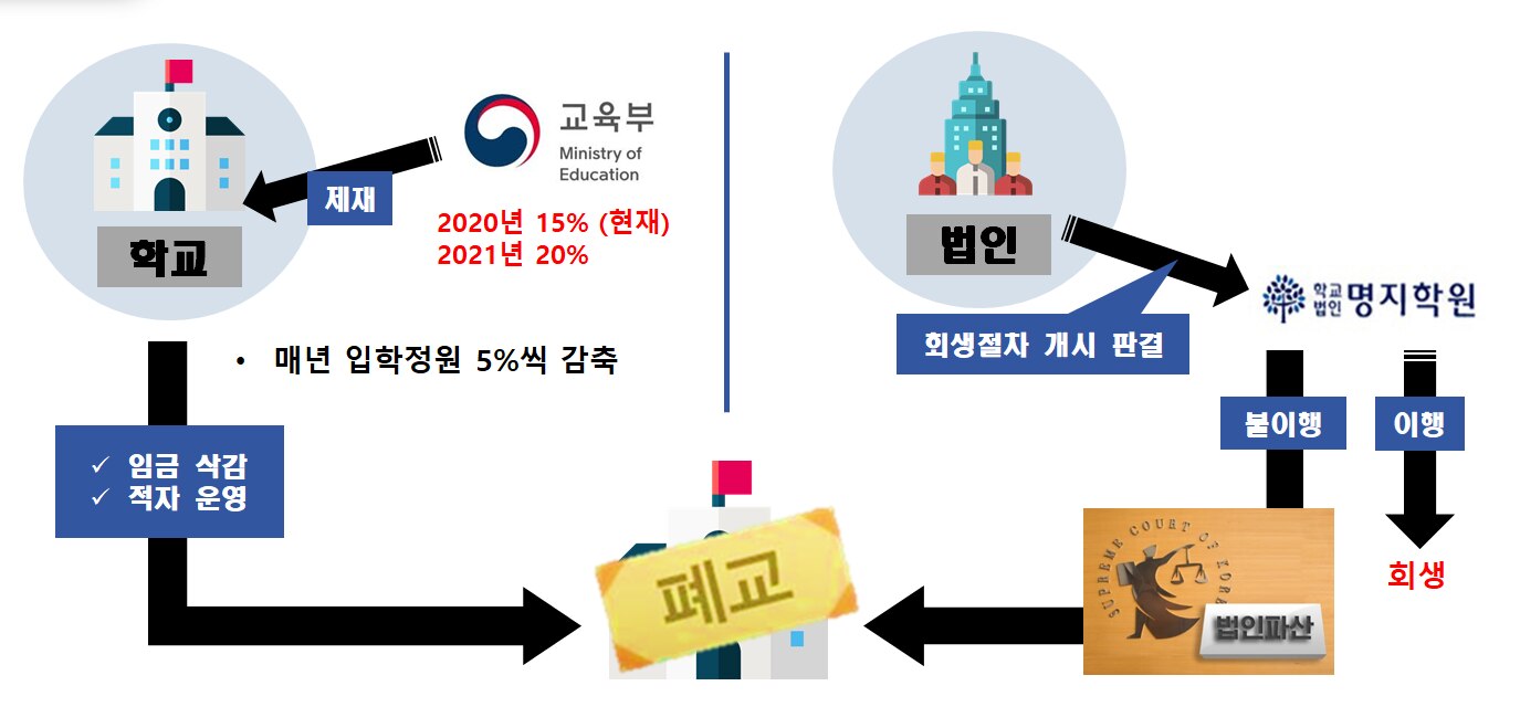 법적으로 문제가 없는 신청이기에 법원은 명지학원을 파산시켜야 하지만 명지대학교를 비롯한 명지학원의 수많은 재학생과 직원 들의 생계를 고민하며 재산 처분 허가권자인 교육부에 대책을 주문합니다. 교육부는 2017년 규정까지 바꿔가며 명지학원의 파산을 막고 채권자들의 피해 금액을 돌려줄 방법을 찾으라고 요구했습니다. 이때 명지대는 5년에 걸쳐 138억을 보전하겠다고 계획을 제출합니다. 하지만 그 약속마저 지켜지지 않았습니다. 3년의 시간이 지나는 동안 명지학원은 자기회생을 위해 제대로 된 노력을 기울이지 않았습니다. 더는 참을 수 없었던 법원이 명지대에 대한 회생절차를 중단하고 파산 선고 준비에 들어갑니다. 명지대는 점점 불리해집니다.