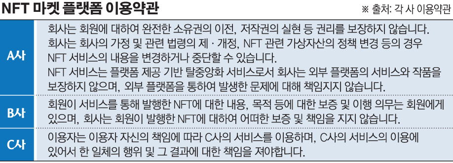 현재 법률상 발행한 업체의 재량이고 회사 청산 시 채권자들이 NFT로 발행한 모든 것들에 대한 권리를 갖게 됩니다. 현재 상황으로 볼 때 NFT는 땅문서도 소유권 증명서도 아닙니다. NFT를 발행 중인 업체들의 약관을 봐도 이에 대해 책임지지 않는다고 명시하는 경우가 대부분입니다. 정말 좋게 생각해서 우리가 생각지도 못한 혁신적인 신기술과 각종 환경이 결합되어 메타버스의 신세계가 펼쳐질 날이 올 수도 있을 겁니다. 빅테크 기업들이 앞으로 끝없이 돈을 쏟아부으면 뭔가 일어날지 모를 일이죠. 하지만 적어도 현재 상황에서 볼 때 대다수 메타버스와 NFT는 암호화폐와 같은 폰지사기에 불과합니다. 초창기에 투자한 극소수의 사람들을 제외하고는 수익을 내기도 늦었습니다. 그래도 기회가 있을 거라고 생각하신다면 차라리 강원랜드에 가서 도박을 하는 편이 나을 겁니다. 같은 투기 도박판이라도 강원랜드에 가면 만질 수 있는 칩이라도 있고 낮은 승률이지만 돈을 벌 가능성은 있으니까요. 메타버스와 NFT의 허상을 잘 파악하여 어려운 시기에 더 어려운 일을 겪지 않으시길 바랍니다.