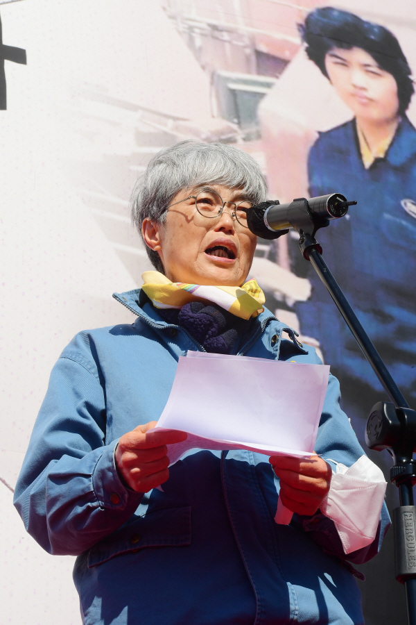 발언 말미에 김진숙 지도위원은 "먼 길 포기하지 않게 해주셔서 고맙습니다. 긴 세월 쓰러지지 않게 버텨주셔서 고맙습니다. 마지막으로 다시 정리해고 위기 앞에선 대우버스 동지여러분 힘내십시오."라며 함께 30여 년간 싸운 이들에게 고마움을 표했습니다. 그러고는 "끝까지 웃으면서 투쟁!"이라는 외침으로 발언을 마무리했습니다.