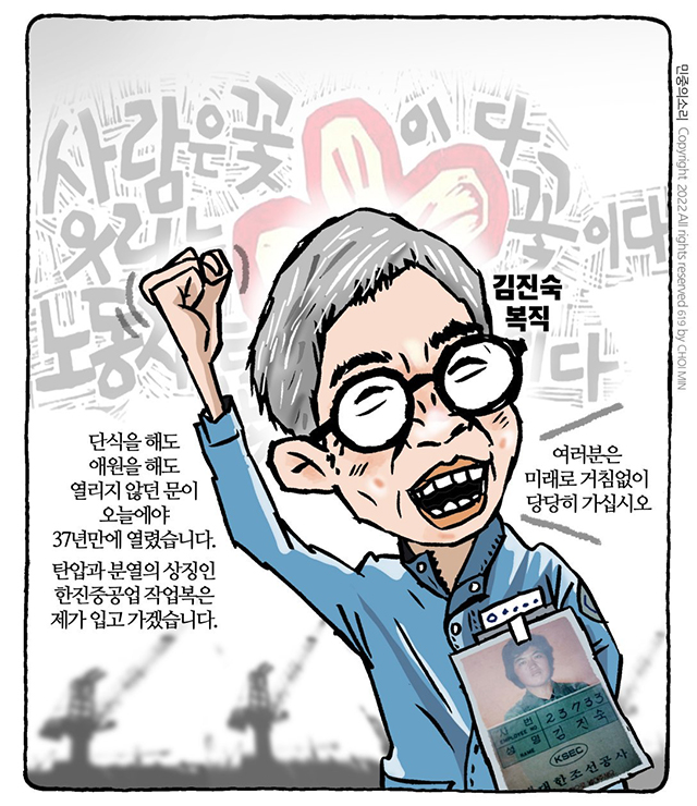 그런데 여기서 그치지 않고 한진 측은 2010년 12월 경영 악화를 이유로 들며 생산직 노동자 400명을 희망퇴직시키기로 결정합니다. 30여 년이 지나도 경영 실책의 책임을 노동자가 떠안는 악습은 계속됐습니다. 김진숙은 이에 반발하여 2011년 1월 6일부터 한진중공업 내 85호 타워크레인에 올라가 고공 농성을 시작했습니다. 노사 합의가 이루어질 때까지 무려 309일간 크레인에서 농성했죠. 2020년에는 한진중공업이 회사를 팔려고 내놓으며 인력 감축을 추진하자 김진숙은 노동자와 연대하는 의미로 복직투쟁을 벌였습니다. 하지만 2021년 2월 한진중공업을 다시 한번 김진숙의 복직 교섭을 결렬시켜버립니다. 김진숙의 복직이 이루어진 건 한진중공업을 동부건설 컨소시엄이 인수해 에이치제이중공업으로 바꾸고 난 뒤의 일입니다.
