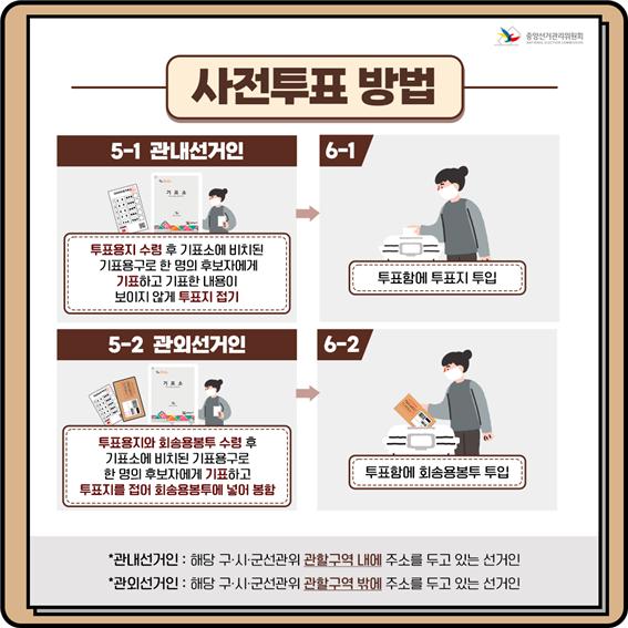 본인 확인을 마친 후 관내선거인과 관외선거인에 따라 투표방법에 다소 차이가 있습니다. 본인의 주소지에서 사전투표를 하시는 관내선거인은 기표소에서 기표한 후 투표함에 바로 넣으시면 됩니다. 자신의 주소지를 담당하는 선관위 관할구역 밖에서 사전투표를 하는 분이라면 기표소에서 기표한 후 투표지를 접어서 회송용 봉투에 넣고 봉하셔야 합니다. 그런 다음 봉투째 투표함에 넣으시면 됩니다.