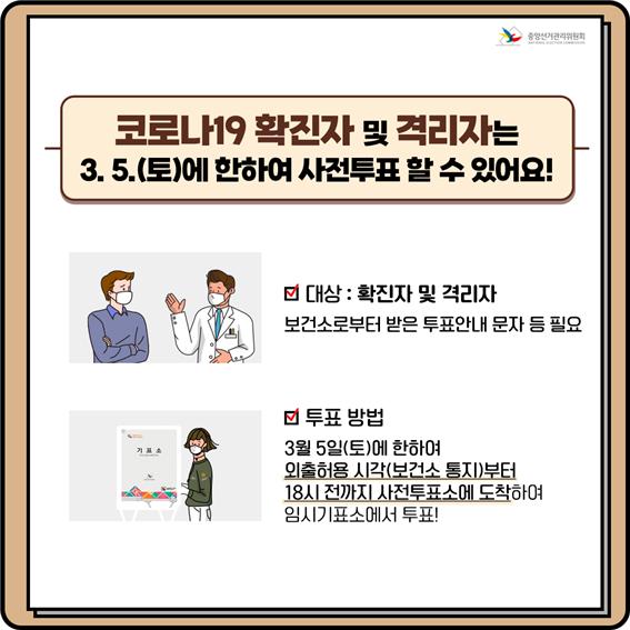 사전투표를 하고자 하는 코로나19 확진자 혹은 확진으로 인해 격리 중인 유권자는 3월 5일 토요일 하루에 한해 투표하실 수 있습니다. 방역당국이 외출허용 시각을 보건소를 통해 통지하며 외출 가능 시간은 오후 5시라고 합니다. 오후 6시 전까지 사전투표소에 도착하셔야 합니다. 당연한 이야기입니다만 확진자 및 격리자들은 투표 종료 후 즉시 귀가하셔야 합니다. 오미크론 변이로 코로나19 상황이 엄중한 가운데 사전투표를 제한적이긴 하지만 허가한 것은 국민의 주권자로서 권리를 행사하라는 의미이지 마음대로 돌아다니라는 의미는 아니니까요.