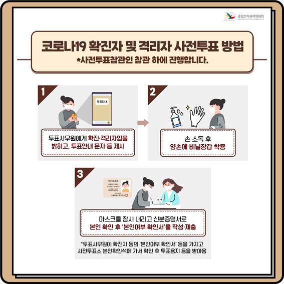 코로나19 확진자 및 격리자는 사전투표를 하기 위해 별도의 준비물이 필요합니다. 신분증과 함께 본인이 확진자이거나 격리자임을 확인받아야 하기 때문입니다. 확진자 등 투표안내 문자나 성명이 기재된 PCR 검사 양성 통지 문자, 입원격리 통지서 등을 투표사무원에게 제시해야 합니다. 신분증만 가지고 갔다가는 투표를 하지 못하는 낭패를 보실 수 있습니다. 신분이 확인된 분은 확진자와 격리자별로 동선을 분리해 별도 설치된 임시 기표소에서 투표하시면 됩니다.