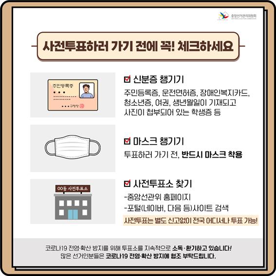 투표를 위한 공통 필수 준비물은 신분증과 마스크입니다. 신분증은 주민등록증, 운전면허증, 장애인 복지카드, 여권 등 생년월일이 기재되고 사진이 붙어 있는 공인된 신분증이면 가능합니다. 마스크는 가능하면 KF94 등 공인된 마스크를 코와 턱에 밀착되도록 제대로 쓰고 가야겠죠. 투표소에서 체온 측정과 손소독을 한 뒤 제공되는 비닐장갑을 착용하시면 됩니다.