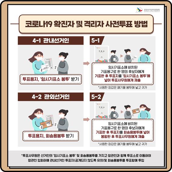 확진자의 경우 관내선거인이라도 임시기표소 봉투를 받아 기표한 투표지를 임시기표소 봉투에 넣어 투표함에 바로 넣는 게 아니라 투표 사무원에게 제출하셔야 합니다. 관외선거인의 경우도 회송용 봉투에 넣은 다음 투표사무원에게 제출하셔야 하고요.