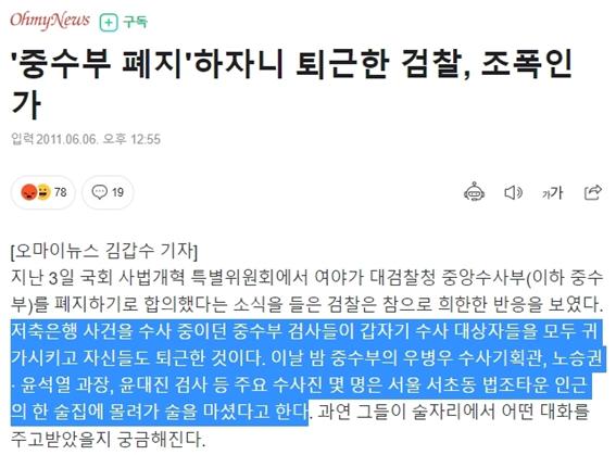 2011년 당시 국회 사법개혁 특위가 대검 중수부를 폐지하기로 하자 부산저축은행 사건을 수사 중이던 중수부 검사들은 갑자기 수사 대상자를 죄다 풀어주고 퇴근해버립니다. 이때 가해자들을 맘대로 풀어주고 조기 퇴근해서 술 마시러 간 이들이 바로 우병우 수사기획관, 노승권, 윤석열 과장, 윤대진 검사 등입니다. 국정농단을 저지른 자들과 그들을 특검한 자들의 면면이 참 화려하죠? 이러니까 사법 카르텔이라는 말이 나오는 겁니다. 어지럽히는 것도 검찰이고 치우는 척하면서 짬짜미하고 봐주는 것도 검찰이니까요. 이런 행적을 밟아온 자가 대통령이 되면 나라가 어떻게 될지 상상하기도 끔찍합니다.