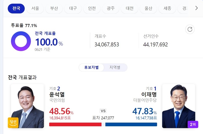 제20대 대통령으로 국민의힘 후보 윤석열이 당선됐습니다. 1987년 직선제 개헌 이후 첫 검사 출신 대통령이며 헌정 사상 가장 적은 표 차이로 간신히 당선된 사례이기도 합니다.