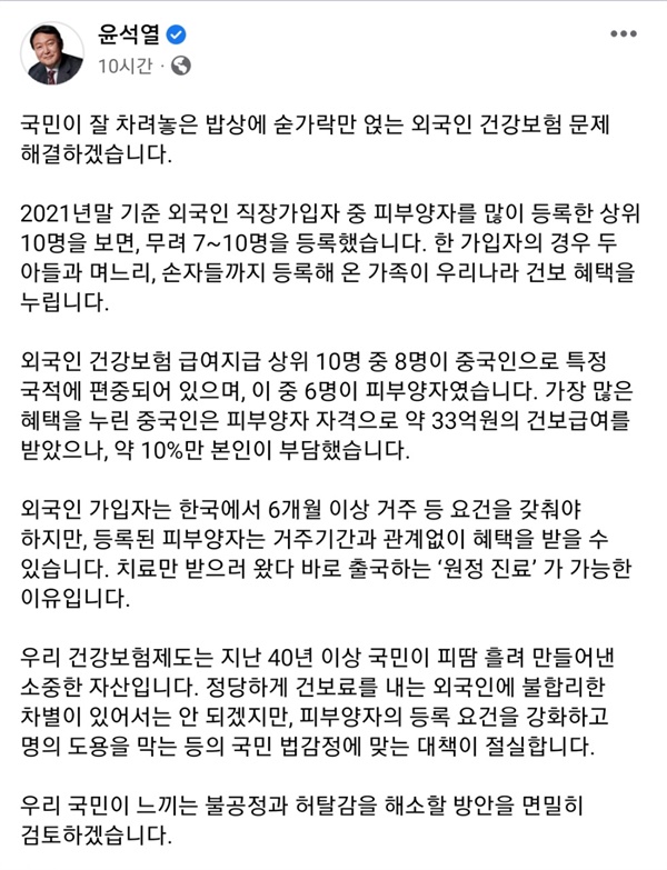 윤석열은 이주노동자들이 건강보험에 숟가락만 얹고 있다며 외국인 혐오 정서에 편승하며 부추겼습니다. 조금만 생각해봐도 현재 외국인 대상 건강보험이 흑자라는 사실을 알 수 있는데도, 그는 막무가내 식으로 불공정과 허탈감을 해소할 방안을 면밀히 검토하겠다고 했죠.