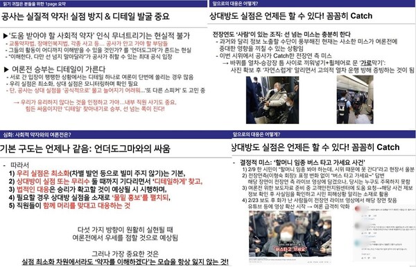 이 문건은 제목부터 가관입니다. <사회적 약자와의 여론전>이라는 제목의 문건은 첫 장부터 지피지기 백전불태라며 손자병법을 인용합니다. 문건 곳곳에 약자는 선하고 강자는 악하다는 뜻의 언더도그마란 표현을 써가면서 대중이 이에 경도돼 원칙과 절차가 유명무실해졌다고 장애인과 대중을 동시에 비난합니다. 문건이 공개되자 서울교통공사는 직원 개인의 의견에 불과하다고 꼬리를 잘랐습니다. 공사 차원에서 장애인 시위에 부정적 여론을 조성하거나 내부 문건을 만든 적 없다면서 말이죠. 하지만 공개된 문건을 보면 장애인 단체의 선 넘는 미스, 그러니까 잘못을 찾아내 '물밑 홍보'를 하자는 내용이 버젓이 실려 있었습니다.