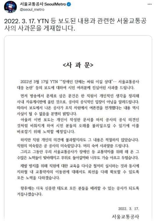 이 사건 역시 당일 보도자료에 공사의 언론 플레이가 고스란히 담겨 있었습니다. 진실이 폭로되자 서울교통공사는 그제야 임종 사건을 거론한 보도자료가 여론전을 위한 것이 아니었다고 변명하기 바빴습니다. 사진과 보도자료를 전달하며 공사가 줬다는 얘기는 하지 말아 달라고 했던 건 장애인 단체와 대립각을 세우지 않기 위해서였다고 일관하면서 말이죠. 서울교통공사는 올해만 국고보조금으로 655억 원을 받는 서울시의 대표적 공기업입니다. 세금으로 운영되고 있으니 시민, 특히 약자를 위한 정책을 마련하고 실행에 몰두해도 모자랄 판에 그 돈을 저런 저열한 언론플레이에 쓰고 있었던 겁니다. 3월 17일 YTN 보도 이후 서울교통공사는 사과문을 올렸습니다. 하지만 "이번 보도는 개인이 작성한 문서를 마치 공사의 공식 의견인 것처럼 비춰지게 하여 시민 분들의 오해를 불러일으킬 수 있기에 이를 바로잡기 위해 노력할 예정"이라고 하여 제대로 된 사과로 보기 어려웠습니다.
